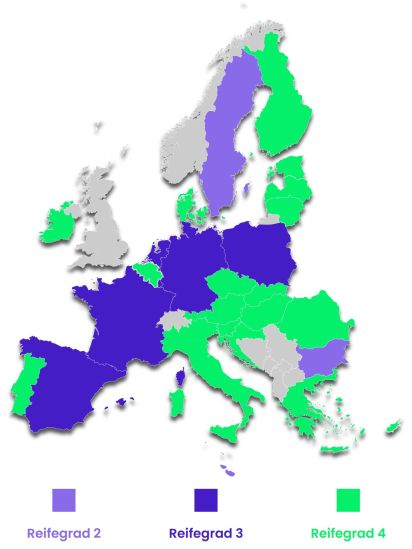 Mehrere wichtige Meilensteine erreicht, mit einem moderaten Umsetzungsgrad. Betroffene Länder: Malta, Schweden, Bulgarien. - Reifegrad 3: