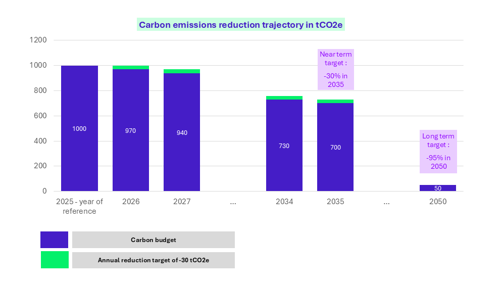 In practice: Based on the previous chart (Figure 1), and assuming a 5% increase in workforce, the projected carbon budget for 2026 is: 1,050 tCO₂e.