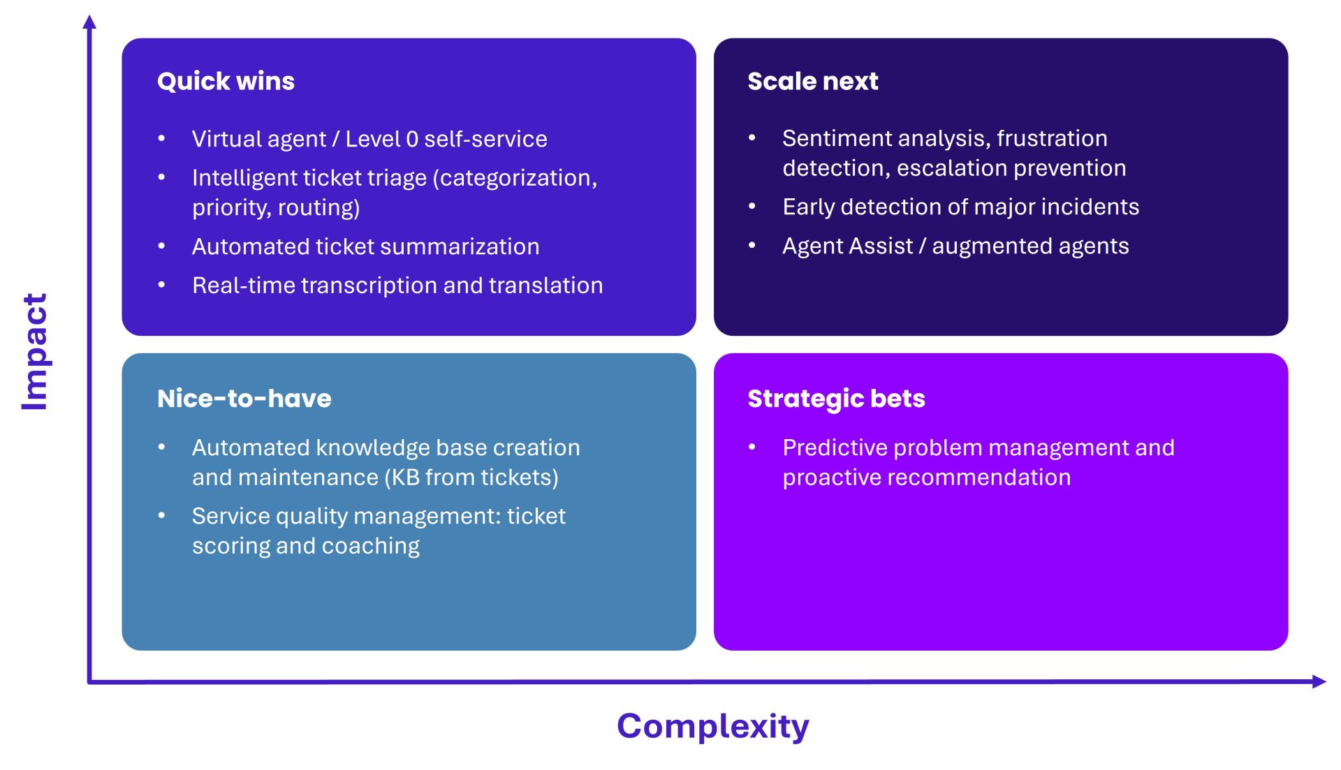 - Early benefits come from simple, fast-to-deploy use cases such as self-service and intelligent triage.