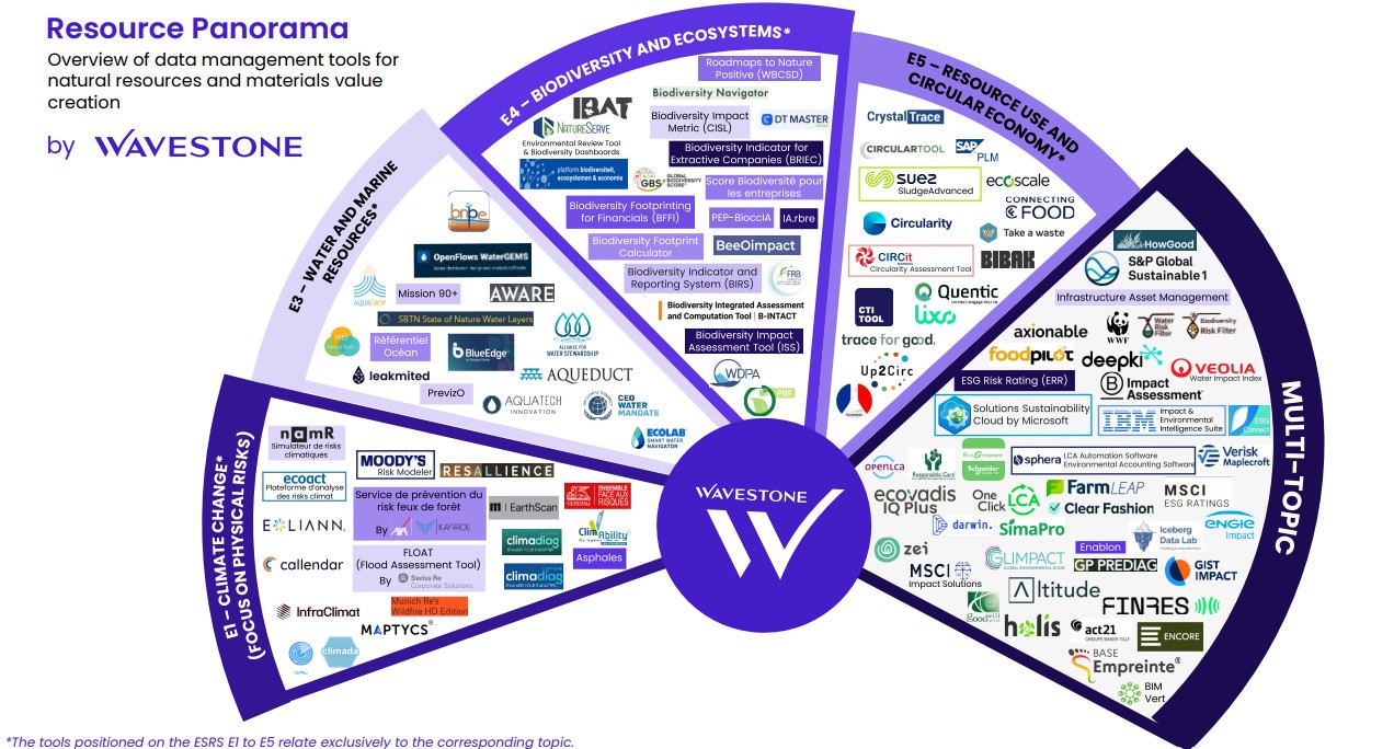 This panorama, however, focuses exclusively on natural resources and materials recovery, which constitute a relatively less mature field of ESG analysis on the market. Many solutions are being developed to help companies gain better control of their environmental data, whether this relates to their own activities or to their value chain. These solutions adopt different positioning, methodologies, levels of accuracy and data coverage, as well as functionalities.
