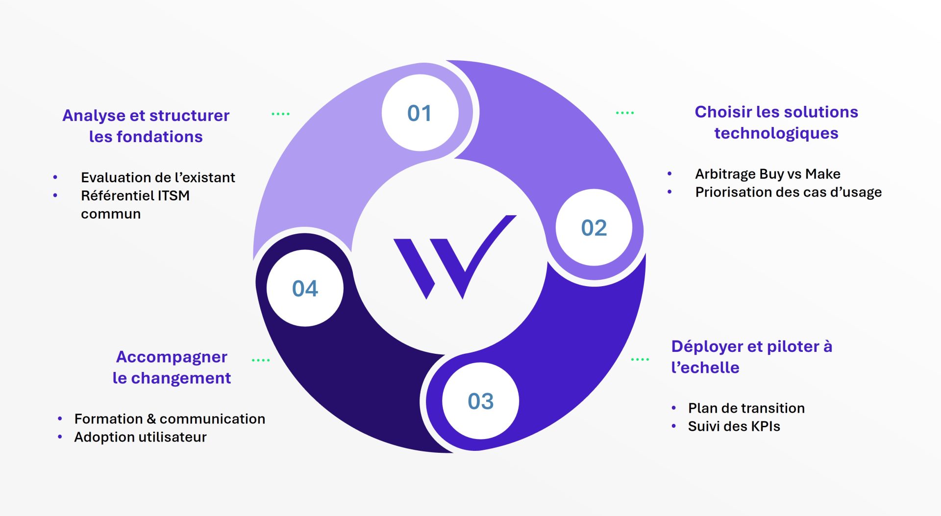 Ces freins soulignent à la fois l’importance de disposer de fondations organisationnelles et technologiques solides, tout en construisant une feuille de route robuste, couvrant l’ensemble du cycle de transformation : de la préparation, au déploiement opérationnel, jusqu’au pilotage de la performance et à l’amélioration continue.