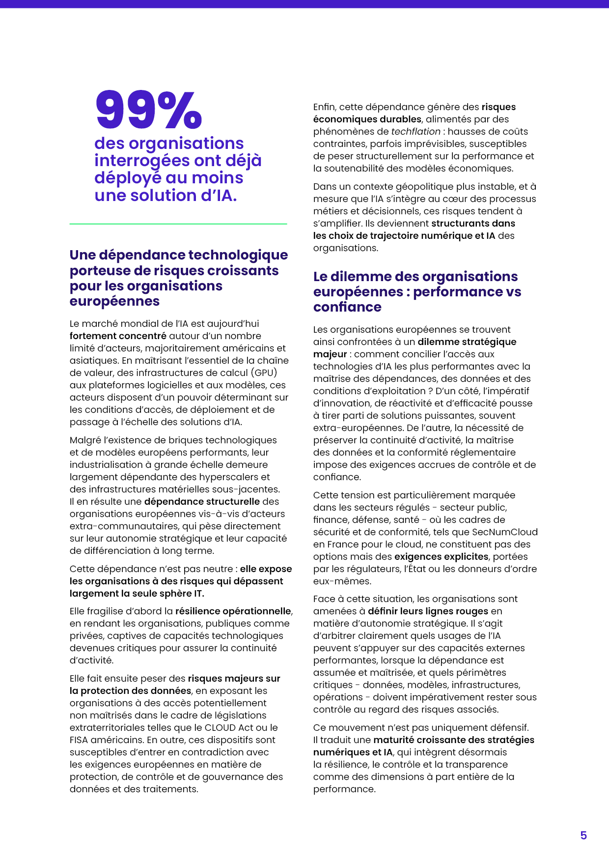 L’intelligence artificielle s’impose désormais comme un levier central de performance, de transformation et de différenciation pour les organisations. Son intégration rapide au cœur des processus métiers et décisionnels ouvre des opportunités majeures de création de valeur. Elle soulève toutefois des enjeux structurants en matière de maîtrise des données, de résilience opérationnelle et de conformité réglementaire, comme l’AI Act, en particulier dans le contexte européen.