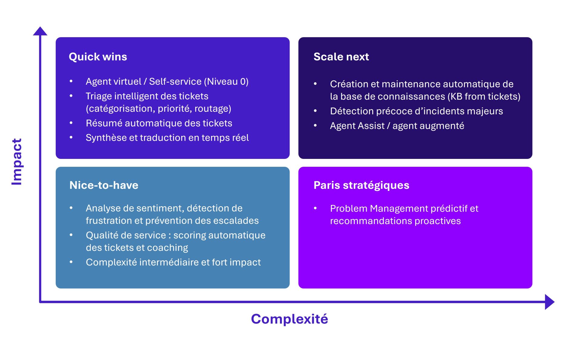 - Les premiers bénéfices proviennent de cas d’usage simples et rapidement activables, comme le self-service ou le triage intelligent.