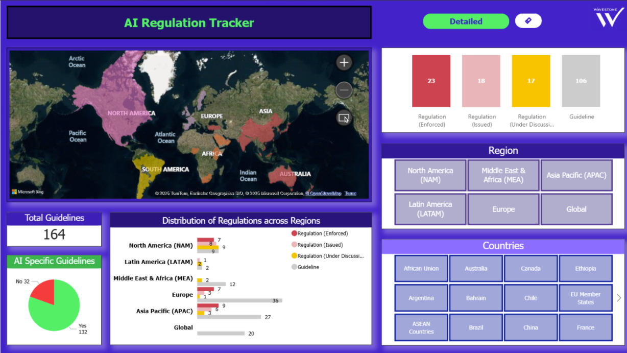 L’équipe Risk Advisory de Wavestone a développé un outil dynamique de suivi des réglementations IA à l’échelle mondiale. Il permet aux entreprises de :
