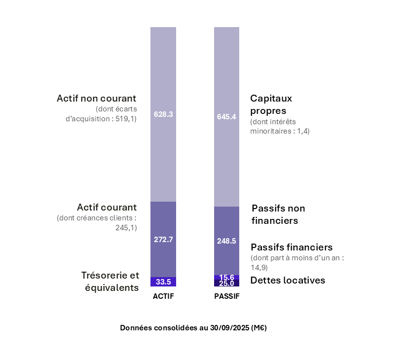 Le graphique présente le bilan consolidé de Wavestone au 30 septembre 2025, réparti en deux colonnes. La première colonne représente l’actif et la seconde le passif.